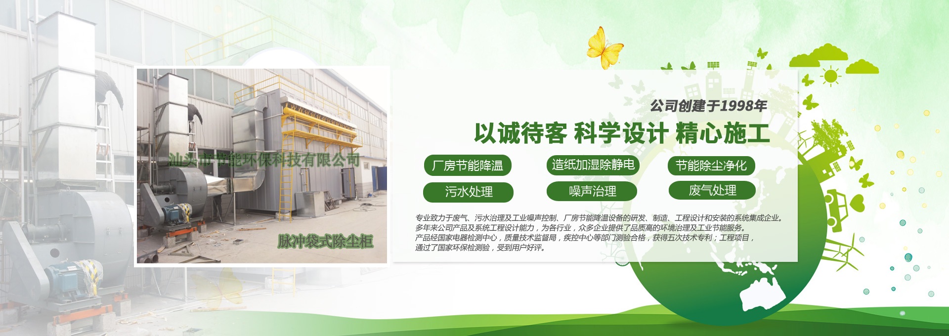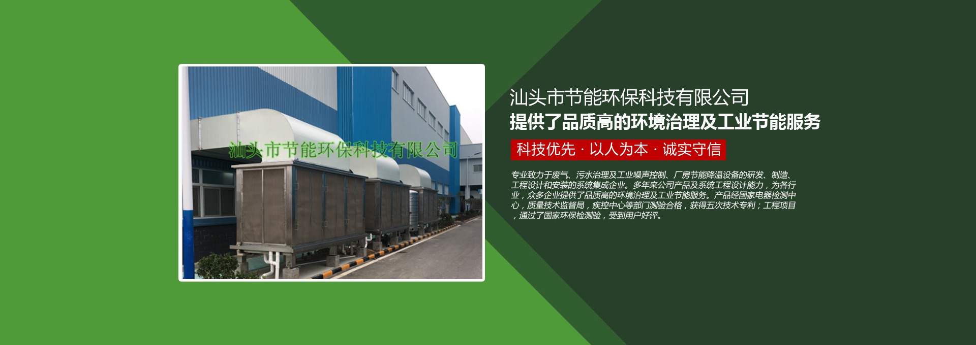 汕頭市節(jié)能環(huán)保科技有限公司創(chuàng)建于1998年,是一家專業(yè)致力于廢氣、污水、粉塵、噪聲治理,廠房節(jié)能降溫設(shè)備的研發(fā)、制造、工程設(shè)計(jì)和安裝的系統(tǒng)集成企業(yè)。多年來(lái)公司產(chǎn)品及系統(tǒng)工程設(shè)計(jì)能力,為各行業(yè),眾多企業(yè)提供了品質(zhì)高的環(huán)境治理及工業(yè)節(jié)能服務(wù)。產(chǎn)品經(jīng)國(guó)家電器檢測(cè)中心,質(zhì)量技術(shù)監(jiān)督局,疾控中心等部門測(cè)驗(yàn)合格,獲得五次技術(shù)專利;工程項(xiàng)目通過(guò)了國(guó)家環(huán)保檢驗(yàn)檢測(cè),受到用戶好評(píng)。
